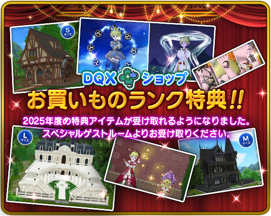 - ※2026年4月1日(水)0:00 ~2026年4月1日(水) 0:29の間に予定しているDQXショップメンテナンス中にキャンペーンなどのアイテムコードで、お買いもの経験値を受け取る場合はご希望の年度へのお買いものランク蓄積が保証されません。2025年度のお買いもの経験値として受け取りたい場合はメンテナンス前に、2026年度のお買いもの経験値として受け取りたい場合はメンテナンス後に、アイテムコードの入力をお願いします。
