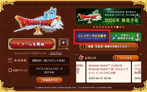 必ずブラウザ版ランチャー内の「プレイデータの引継ぎ ─ アカウントの作成 ─」を選択したうえで、2026年6月25日(木)メンテナンスまでに プレイデータの引継ぎ(スクウェア・エニックス アカウントの作成)を行ってください。
